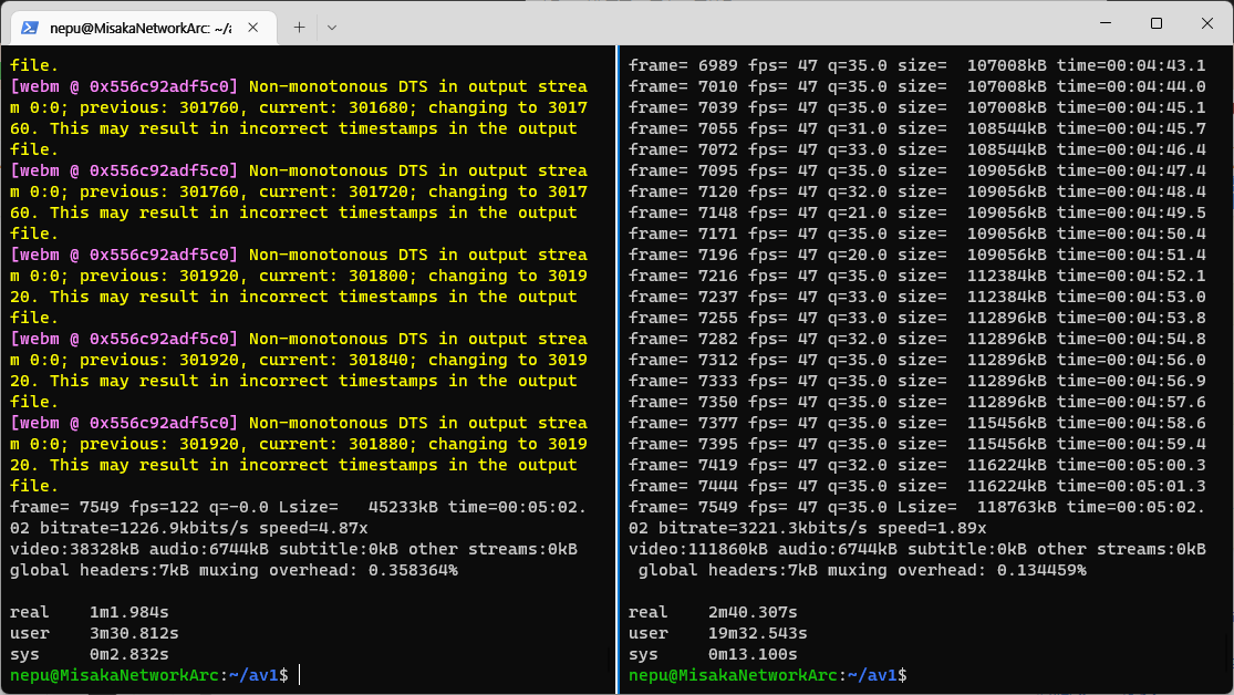 GPU는 av1_qsv으로, CPU는 libsvtav1로 인코딩을 진행했습니다