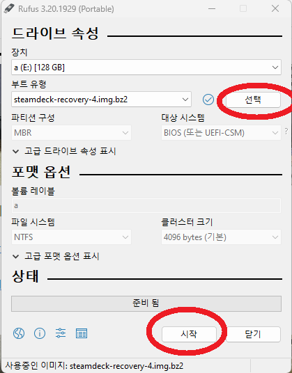 선택을 눌러 받으신 steamdeck-recovery-4.img.bz2를 선택해주시고