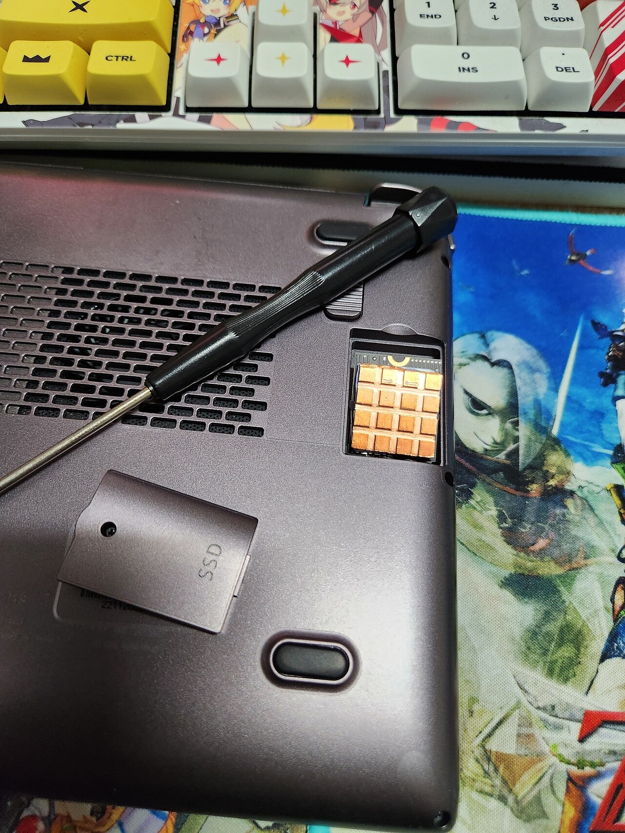 저 방열판겸 쇼트방지은박지는 쓱 빠지니 빼시고 교체해줄 SSD에 다시 껴줍니다.